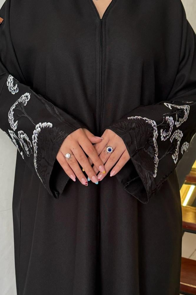 - تصميم أنيق: القصّة الأنيقة والأكمام المطرزة تجعل العباية قطعة فنية.