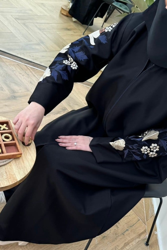 - التطريز الراقي: أكمام مزينة بزخارف زهرية أنيقة بتداخل ألوان متناغمة من الأبيض والأزرق تضيف لمسة فاخرة وجمالية راقية للعباية.