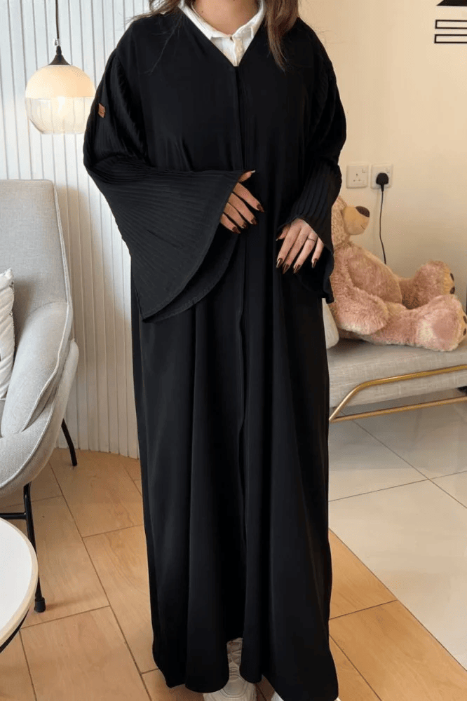 من أبرز صيحات هذا الموسم عباية سوداء كريب ذات الأكمام المموجة وتتميز هذه العباية بتفاصيل الأكمام التي تأتي بتصميم فريد، حيث تتداخل طبقات من الكريب بشكل يضفي حركة وأناقة على الإطلالة والتصميم المموج يخلق تأثيرًا بصريًا جميلاً يجعل العباية تبدو أكثر فخامة، مما يناسب مختلف المناسبات سواء كانت يومية أو رسمية ويمكن تنسيق هذه العباية مع أكسسوارات ذهبية أو فضية لإضفاء لمسة من الفخامة.